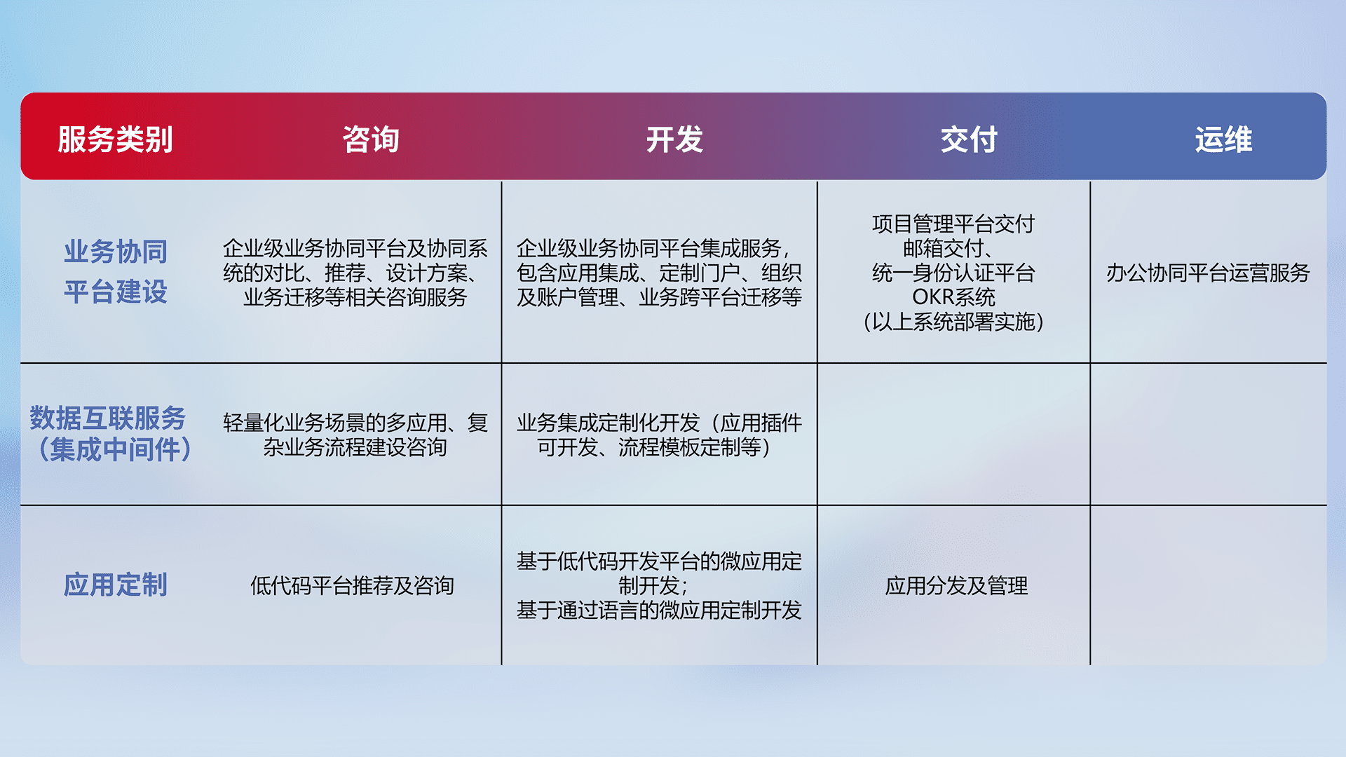 针对钉钉、、、、企微、、、、IDaas等平台级产品提供产品的规划、、、、方案、、、交付、、、定制化开发等服务,,,,实现如统一协同办公、、、、智能客户服务、、混合会议管理、、智能数据查询、、、、等业务场景,,实现数字化转型。。